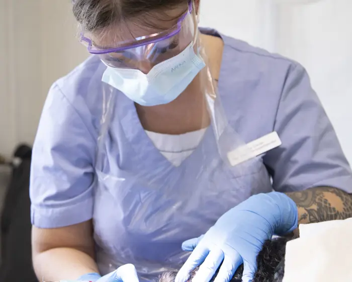 Under behandlingen gennemgår vi tænderne systematisk. Vi måler tandkødslommer, vurderer tændernes overflade, farve og slid samt kontrollerer, om der er løse tænder eller skader på tandkronerne. Alle fund noteres i journalen, så der kan følges op ved fremtidige kontroller.